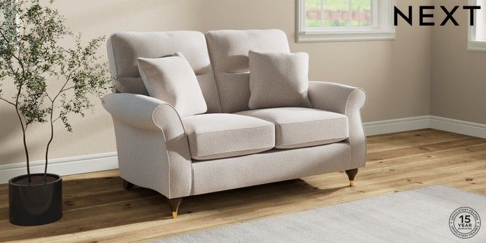 7.2.10 Ashford Highback 2 Seater Small Sofa Cotswold Chenille Oyster Modern Turned Metal Cap - Mid | Made Click here to use our website with more accessibility support, for example screen readers