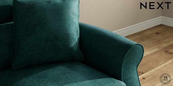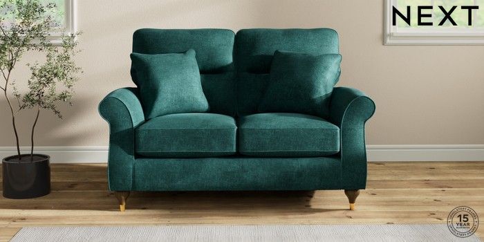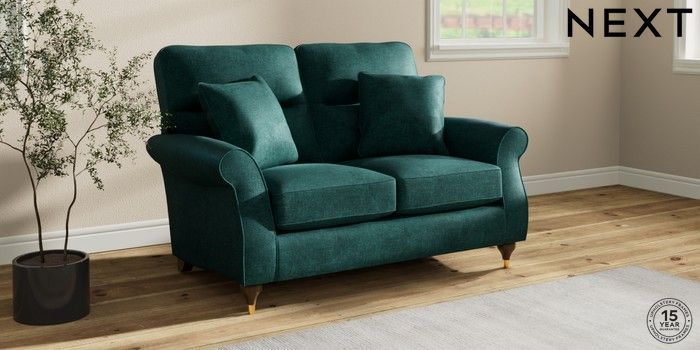 7.2.10 Ashford Highback 2 Seater Small Sofa Plush Chenille Dark Teal Green Modern Turned Metal Cap - Mid | Made Click here to use our website with more accessibility support, for example screen readers