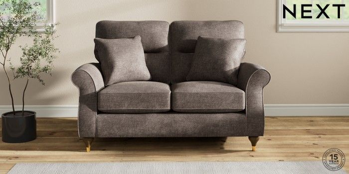 7.2.10 Ashford Highback 2 Seater Small Sofa Plush Chenille Mink Brown Modern Turned Metal Cap - Mid | Made Click here to use our website with more accessibility support, for example screen readers