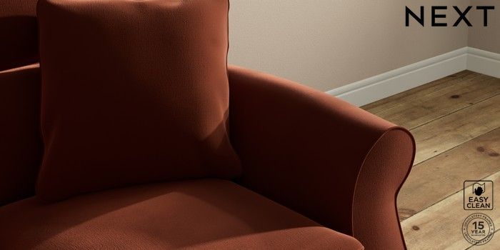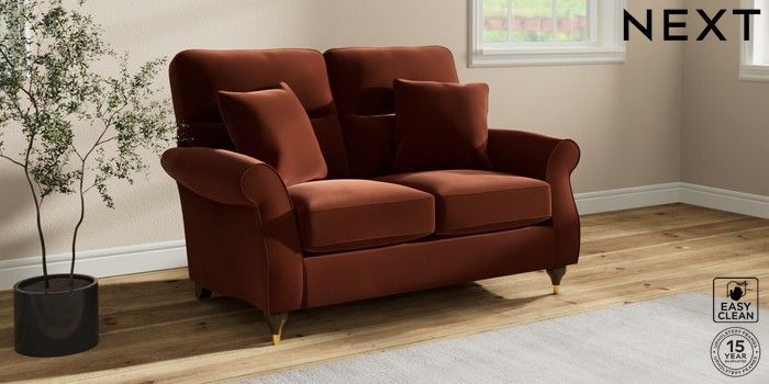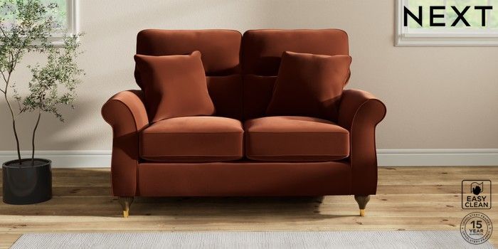 7.2.10 Ashford Highback 2 Seater Small Sofa Plush Velvet Easy Clean Ginger Orange Modern Turned Metal Cap - Mid | Made Click here to use our website with more accessibility support, for example screen readers