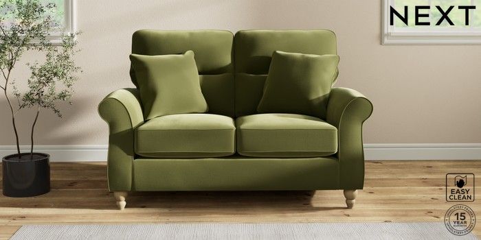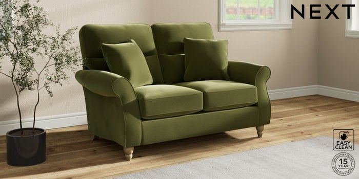 7.2.10 Ashford Highback 2 Seater Small Sofa Plush Velvet Easy Clean Mid Olive Green Low Turned - Light | Made Click here to use our website with more accessibility support, for example screen readers