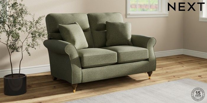 7.2.10 Ashford Highback 2 Seater Small Sofa Tweedy Chenille Mid Moss Green Modern Turned Metal Cap - Mid | Made Click here to use our website with more accessibility support, for example screen readers
