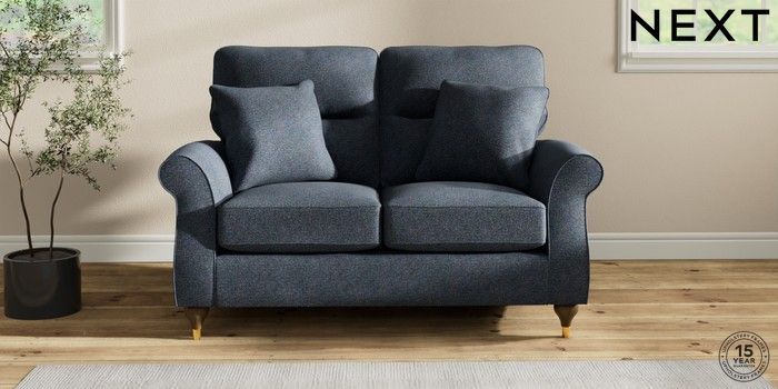 7.2.10 Ashford Highback 2 Seater Small Sofa Tweedy Chenille Navy Blue Modern Turned Metal Cap - Mid | Made Click here to use our website with more accessibility support, for example screen readers