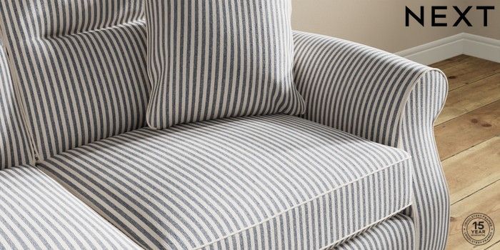 7.2.10 Ashford Highback 2 Seater Sofa Chenille Stripe Slate Blue Modern Turned Metal Cap - Mid | Made Click here to use our website with more accessibility support, for example screen readers
