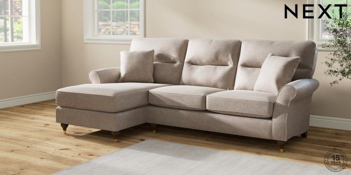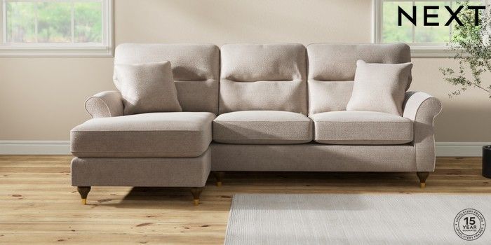 7.2.10 Ashford Highback Medium Sofa Chaise - Left Hand Boucle Chenille Light Natural Modern Turned Metal Cap - Mid | Made Click here to use our website with more accessibility support, for example screen readers