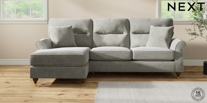 7.2.10 Ashford Highback Medium Sofa Chaise - Left Hand Chunky Chenille Light Grey Modern Turned Metal Cap - Mid | Made Click here to use our website with more accessibility support, for example screen readers