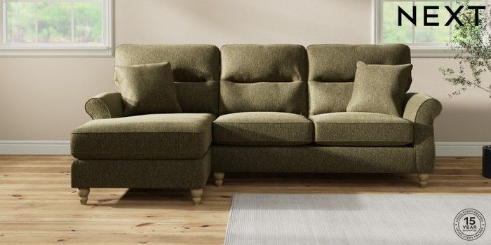 7.2.10 Ashford Highback Medium Sofa Chaise - Left Hand Cotswold Chenille Dark Green Low Turned - Light | Made Click here to use our website with more accessibility support, for example screen readers