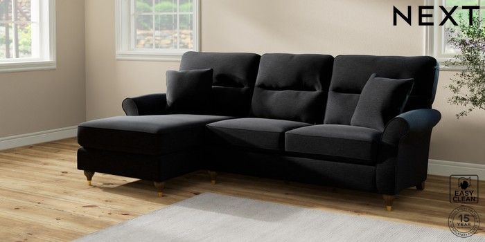 7.2.10 Ashford Highback Medium Sofa Chaise - Left Hand Fine Chenille Easy Clean Black Modern Turned Metal Cap - Mid | Made Click here to use our website with more accessibility support, for example screen readers