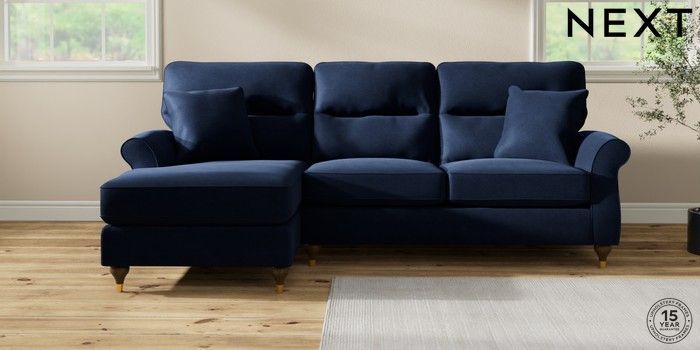 7.2.10 Ashford Highback Medium Sofa Chaise - Left Hand Luxe Chenille Navy Blue Modern Turned Metal Cap - Mid | Made Click here to use our website with more accessibility support, for example screen readers