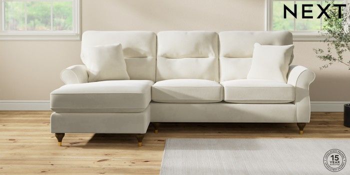 7.2.10 Ashford Highback Medium Sofa Chaise - Left Hand Luxe Chenille Oyster Modern Turned Metal Cap - Mid | Made Click here to use our website with more accessibility support, for example screen readers