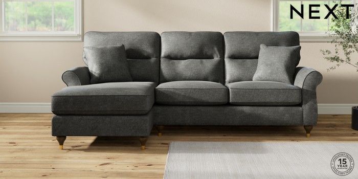 7.2.10 Ashford Highback Medium Sofa Chaise - Left Hand Plush Chenille Dark Grey Modern Turned Metal Cap - Mid | Made Click here to use our website with more accessibility support, for example screen readers