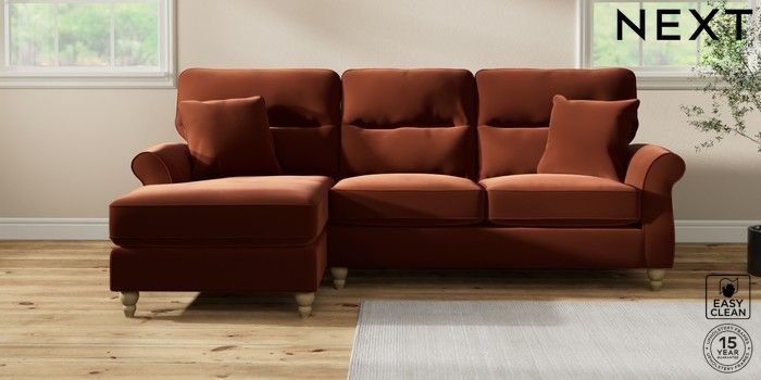7.2.10 Ashford Highback Medium Sofa Chaise - Left Hand Plush Velvet Easy Clean Ginger Orange Low Turned - Light | Made Click here to use our website with more accessibility support, for example screen readers