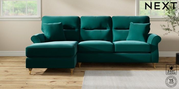 7.2.10 Ashford Highback Medium Sofa Chaise - Left Hand Plush Velvet Easy Clean Juniper Green Castor - Light | Made Click here to use our website with more accessibility support, for example screen readers