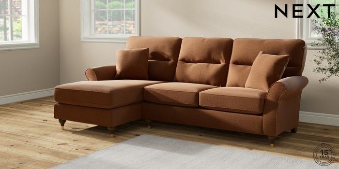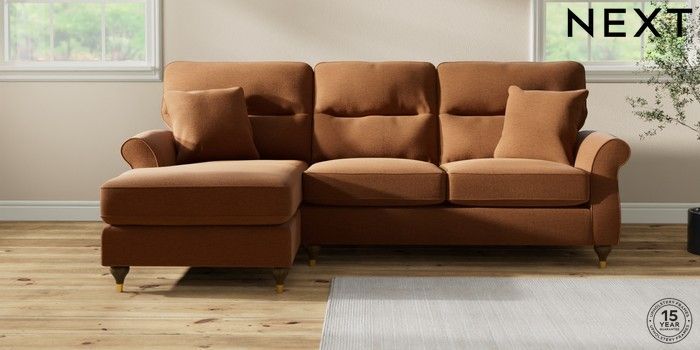 7.2.10 Ashford Highback Medium Sofa Chaise - Left Hand Ripple Chenille Mid Rust Brown Modern Turned Metal Cap - Mid | Made Click here to use our website with more accessibility support, for example screen readers