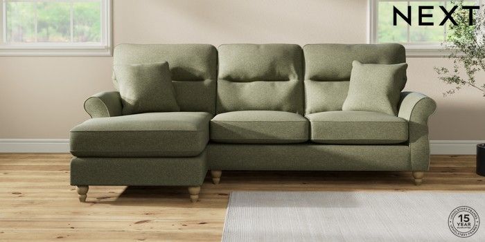 7.2.10 Ashford Highback Medium Sofa Chaise - Left Hand Tweedy Chenille Mid Moss Green Low Turned - Light | Made Click here to use our website with more accessibility support, for example screen readers
