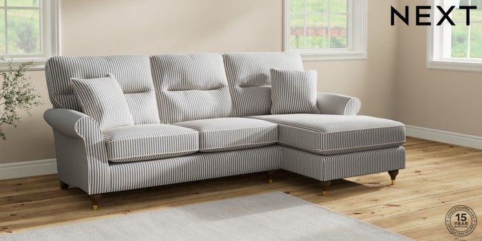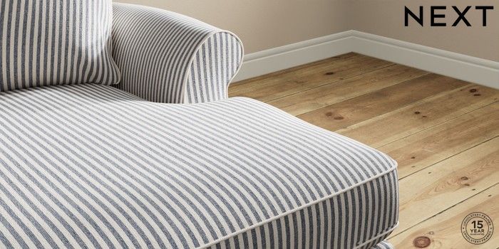 7.2.10 Ashford Highback Medium Sofa Chaise - Right Hand Chenille Stripe Slate Blue Modern Turned Metal Cap - Mid | Made Click here to use our website with more accessibility support, for example screen readers