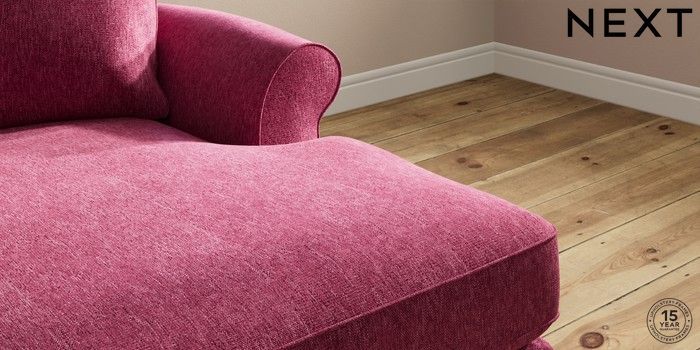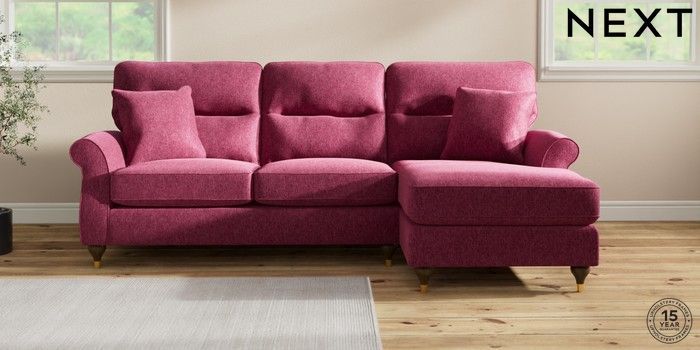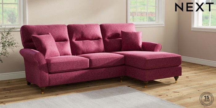 7.2.10 Ashford Highback Medium Sofa Chaise - Right Hand Cotswold Chenille Dark Raspberry Pink Modern Turned Metal Cap - Mid | Made Click here to use our website with more accessibility support, for example screen readers