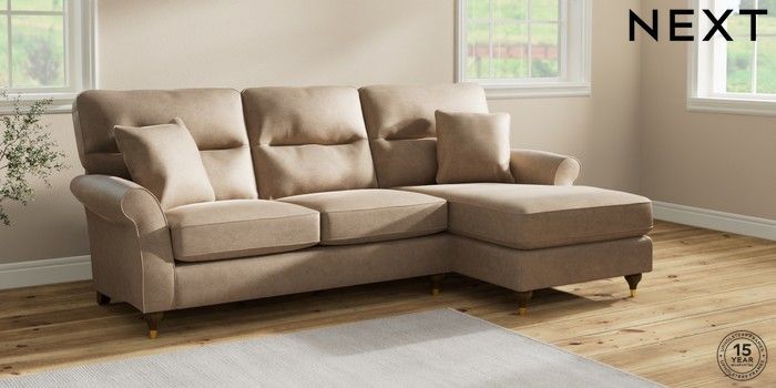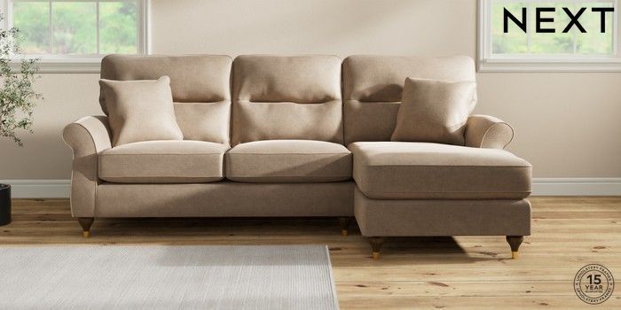 7.2.10 Ashford Highback Medium Sofa Chaise - Right Hand Luxe Chenille Mid Camel Beige Modern Turned Metal Cap - Mid | Made Click here to use our website with more accessibility support, for example screen readers