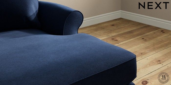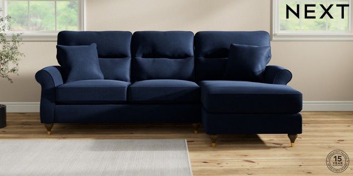 7.2.10 Ashford Highback Medium Sofa Chaise - Right Hand Luxe Chenille Navy Blue Modern Turned Metal Cap - Mid | Made Click here to use our website with more accessibility support, for example screen readers