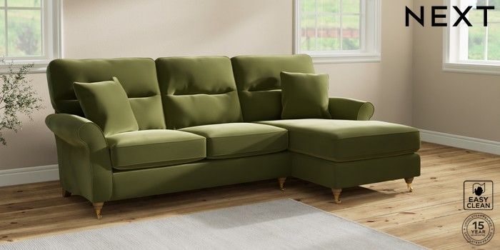 7.2.10 Ashford Highback Medium Sofa Chaise - Right Hand Plush Velvet Easy Clean Mid Olive Green Castor - Light | Made Click here to use our website with more accessibility support, for example screen readers