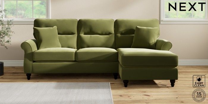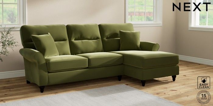7.2.10 Ashford Highback Medium Sofa Chaise - Right Hand Plush Velvet Easy Clean Mid Olive Green Low Turned - Dark | Made Click here to use our website with more accessibility support, for example screen readers