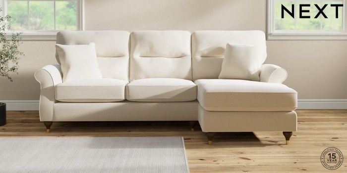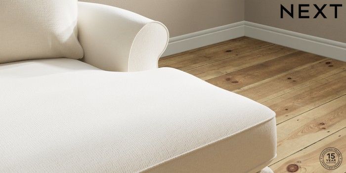 7.2.10 Ashford Highback Medium Sofa Chaise - Right Hand Ripple Chenille Oyster Modern Turned Metal Cap - Mid | Made Click here to use our website with more accessibility support, for example screen readers