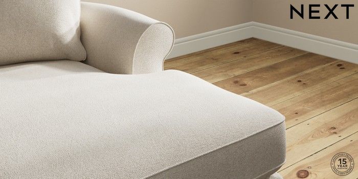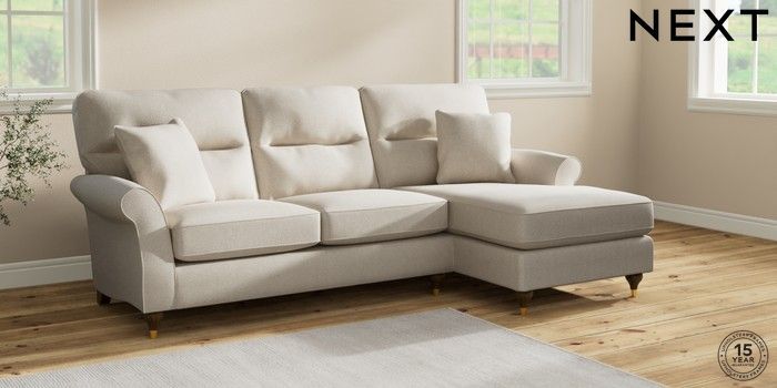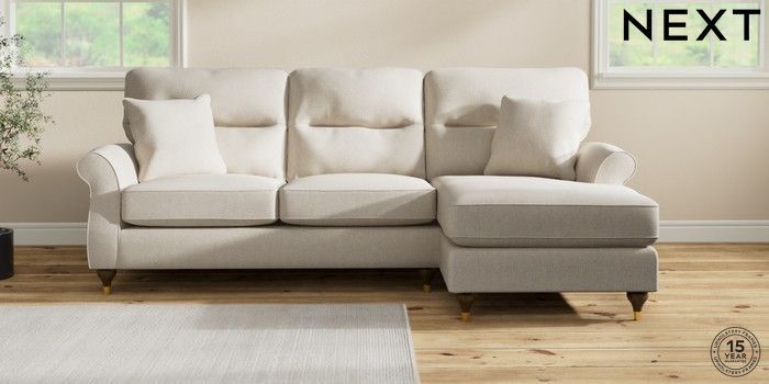 7.2.10 Ashford Highback Medium Sofa Chaise - Right Hand Tweedy Chenille Oyster Modern Turned Metal Cap - Mid | Made Click here to use our website with more accessibility support, for example screen readers
