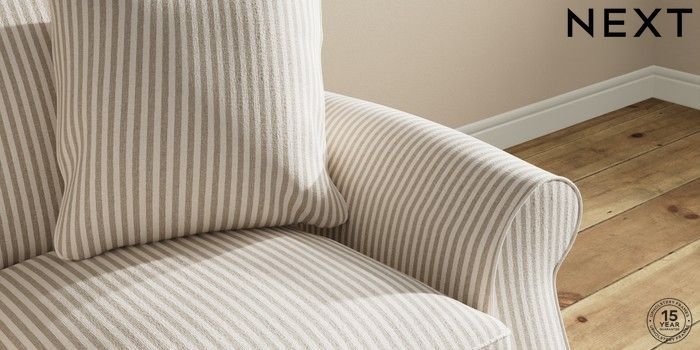 7.2.10 Ashford Relaxed Sit 2 Seater Small Sofa Chenille Stripe Natural Modern Turned Metal Cap - Mid | Made Click here to use our website with more accessibility support, for example screen readers