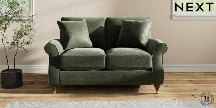 7.2.10 Ashford Relaxed Sit 2 Seater Small Sofa Luxe Chenille Mid Green Modern Turned Metal Cap - Mid | Made Click here to use our website with more accessibility support, for example screen readers