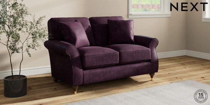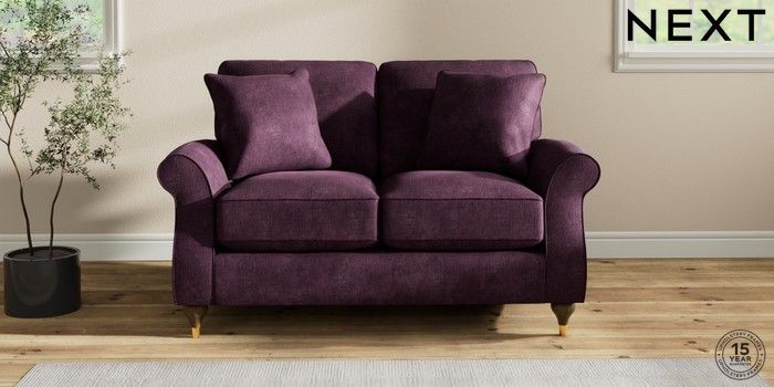7.2.10 Ashford Relaxed Sit 2 Seater Small Sofa Plush Chenille Dark Plum Purple Modern Turned Metal Cap - Mid | Made Click here to use our website with more accessibility support, for example screen readers