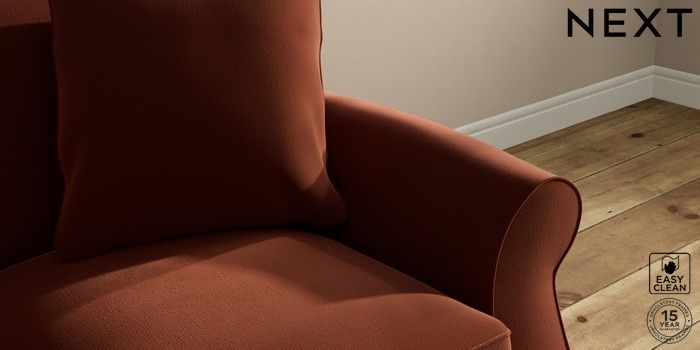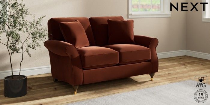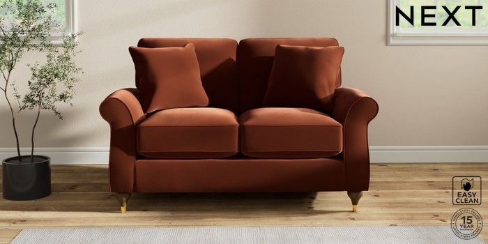 7.2.10 Ashford Relaxed Sit 2 Seater Small Sofa Plush Velvet Easy Clean Ginger Orange Modern Turned Metal Cap - Mid | Made Click here to use our website with more accessibility support, for example screen readers