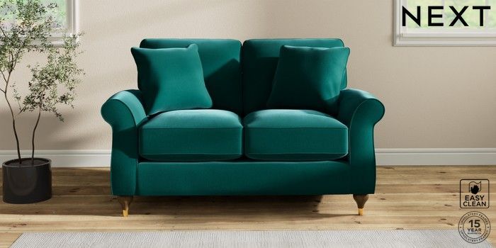 7.2.10 Ashford Relaxed Sit 2 Seater Small Sofa Plush Velvet Easy Clean Juniper Green Modern Turned Metal Cap - Mid | Made Click here to use our website with more accessibility support, for example screen readers