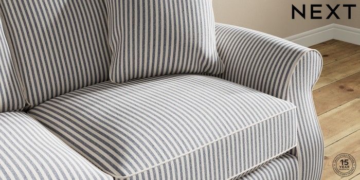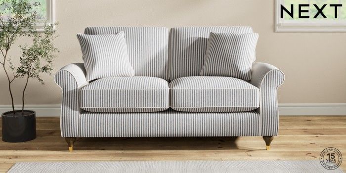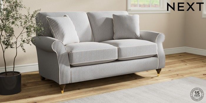 7.2.10 Ashford Relaxed Sit 2 Seater Sofa Chenille Stripe Slate Blue Modern Turned Metal Cap - Mid | Made Click here to use our website with more accessibility support, for example screen readers