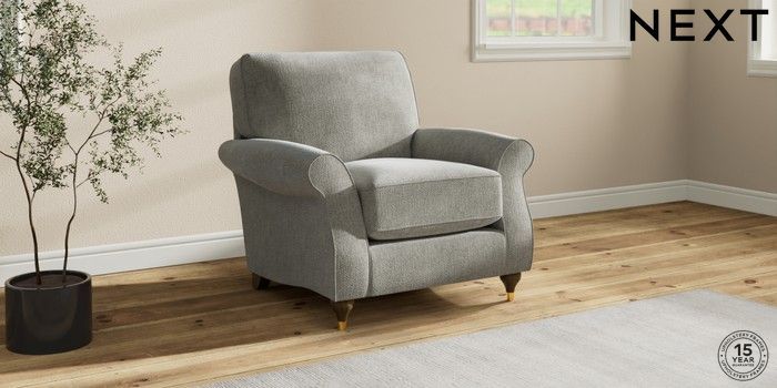 7.2.10 Ashford Relaxed Sit Armchair Chunky Chenille Light Grey Modern Turned Metal Cap - Mid | Made Click here to use our website with more accessibility support, for example screen readers