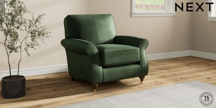 7.2.10 Ashford Relaxed Sit Armchair Luxe Chenille Dark Green Modern Turned Metal Cap - Mid | Made Click here to use our website with more accessibility support, for example screen readers