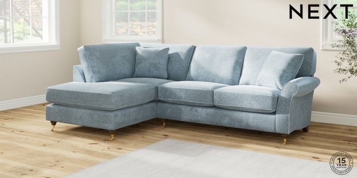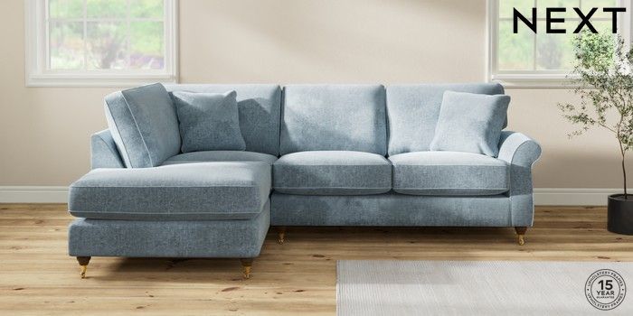7.2.10 Ashford Relaxed Sit Medium Corner Chaise - Left Hand Plush Chenille Light Blue Castor - Mid | Made Click here to use our website with more accessibility support, for example screen readers