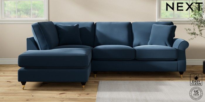 7.2.10 Ashford Relaxed Sit Medium Corner Chaise - Left Hand Plush Velvet Easy Clean Airforce Blue Castor - Dark | Made Click here to use our website with more accessibility support, for example screen readers