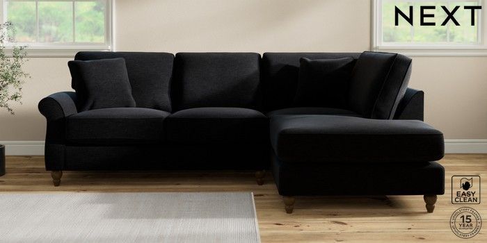 7.2.10 Ashford Relaxed Sit Medium Corner Chaise - Right Hand Fine Chenille Easy Clean Black Low Turned - Mid | Made Click here to use our website with more accessibility support, for example screen readers