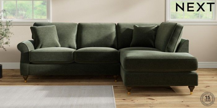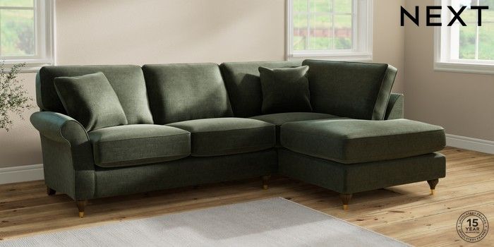 7.2.10 Ashford Relaxed Sit Medium Corner Chaise - Right Hand Luxe Chenille Mid Green Modern Turned Metal Cap - Mid | Made Click here to use our website with more accessibility support, for example screen readers