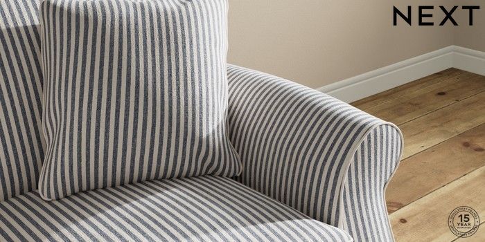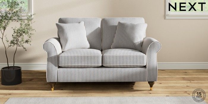 7.2.10 Ashford 2 Seater Small Sofa Chenille Stripe Slate Blue Modern Turned Metal Cap - Mid | Made Click here to use our website with more accessibility support, for example screen readers