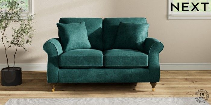 7.2.10 Ashford 2 Seater Small Sofa Plush Chenille Dark Teal Green Modern Turned Metal Cap - Mid | Made Click here to use our website with more accessibility support, for example screen readers