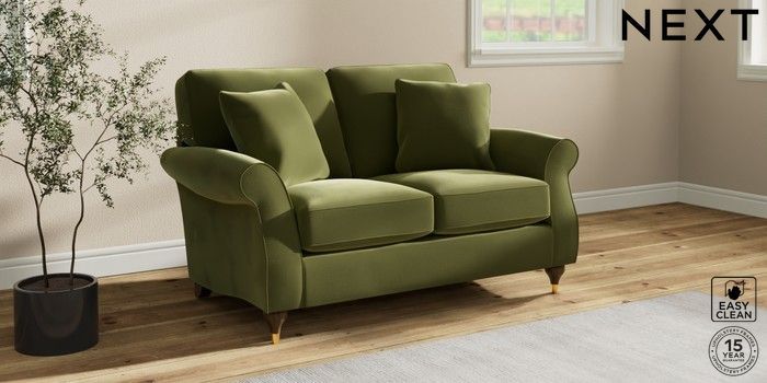 7.2.10 Ashford 2 Seater Small Sofa Plush Velvet Easy Clean Mid Olive Green Modern Turned Metal Cap - Mid | Made Click here to use our website with more accessibility support, for example screen readers