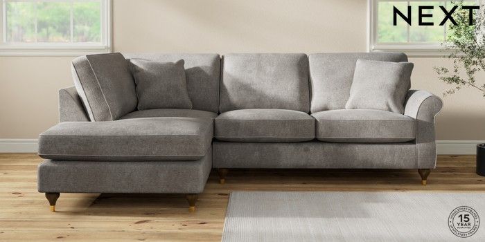 7.2.10 Ashford Medium Corner Chaise - Left Hand Plush Chenille Light Grey Modern Turned Metal Cap - Mid | Made Click here to use our website with more accessibility support, for example screen readers