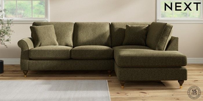 7.2.10 Ashford Medium Corner Chaise - Right Hand Cotswold Chenille Dark Green Modern Turned Metal Cap - Mid | Made Click here to use our website with more accessibility support, for example screen readers
