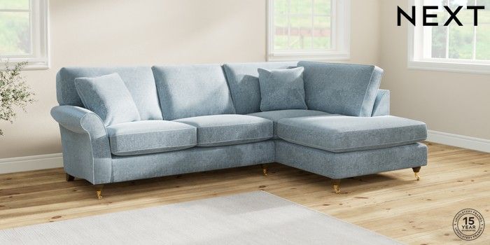7.2.10 Ashford Medium Corner Chaise - Right Hand Plush Chenille Light Blue Castor - Mid | Made Click here to use our website with more accessibility support, for example screen readers