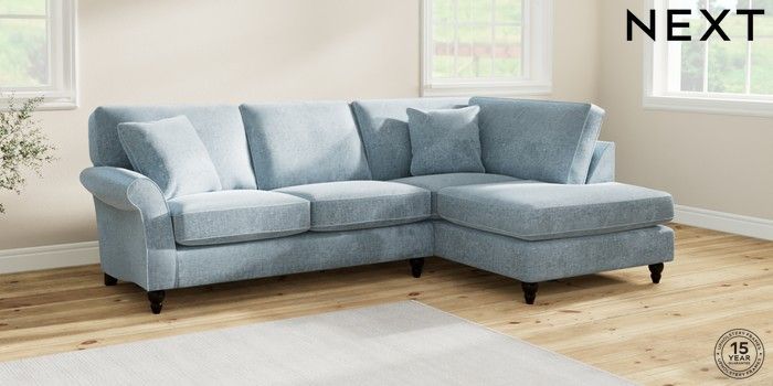7.2.10 Ashford Medium Corner Chaise - Right Hand Plush Chenille Light Blue Low Turned - Dark | Made Click here to use our website with more accessibility support, for example screen readers