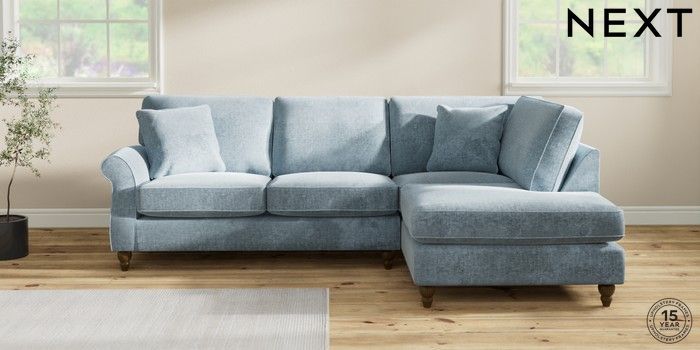 7.2.10 Ashford Medium Corner Chaise - Right Hand Plush Chenille Light Blue Low Turned - Mid | Made Click here to use our website with more accessibility support, for example screen readers