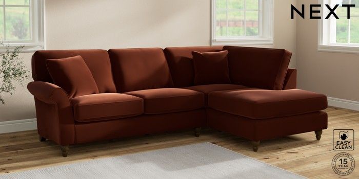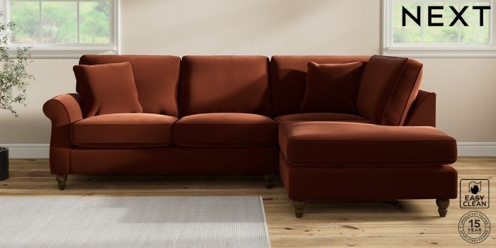 7.2.10 Ashford Medium Corner Chaise - Right Hand Plush Velvet Easy Clean Ginger Orange Low Turned - Mid | Made Click here to use our website with more accessibility support, for example screen readers