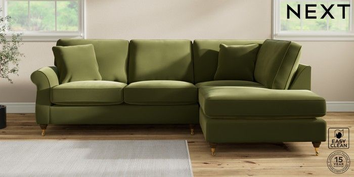7.2.10 Ashford Medium Corner Chaise - Right Hand Plush Velvet Easy Clean Mid Olive Green Castor - Mid | Made Click here to use our website with more accessibility support, for example screen readers