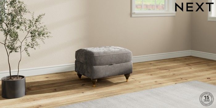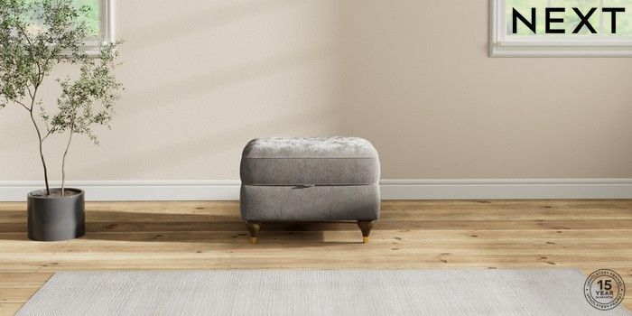 7.2.10 Ashford Storage Footstool Distressed Velour French Grey Modern Turned Metal Cap - Mid | Made Click here to use our website with more accessibility support, for example screen readers